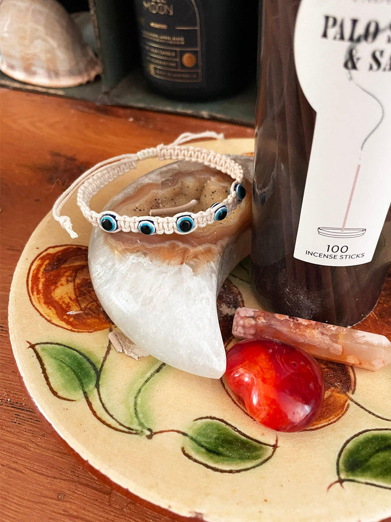 Featuring five Evil Eye beads, a symbol of good fortune, this personal talisman is perfect for layering or wearing solo as a daily reminder of serene coastal escapes. The adjustable waxed cotton cord ensures a comfortable fit for all, making it an easy, go-to accessory for adding a touch of Mediterranean flair to any look.