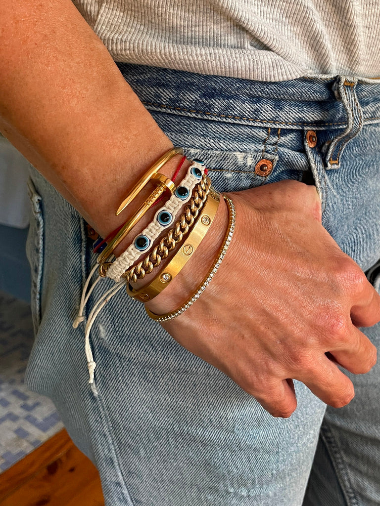 Embrace the magic of a sun-soaked Greek summer with the CYRUS Mega Evil Eye Bracelet. Designed to protect and bring positivity, this bracelet captures the timeless charm of the Greek islands, where white-washed walls meet the deep blue sea.