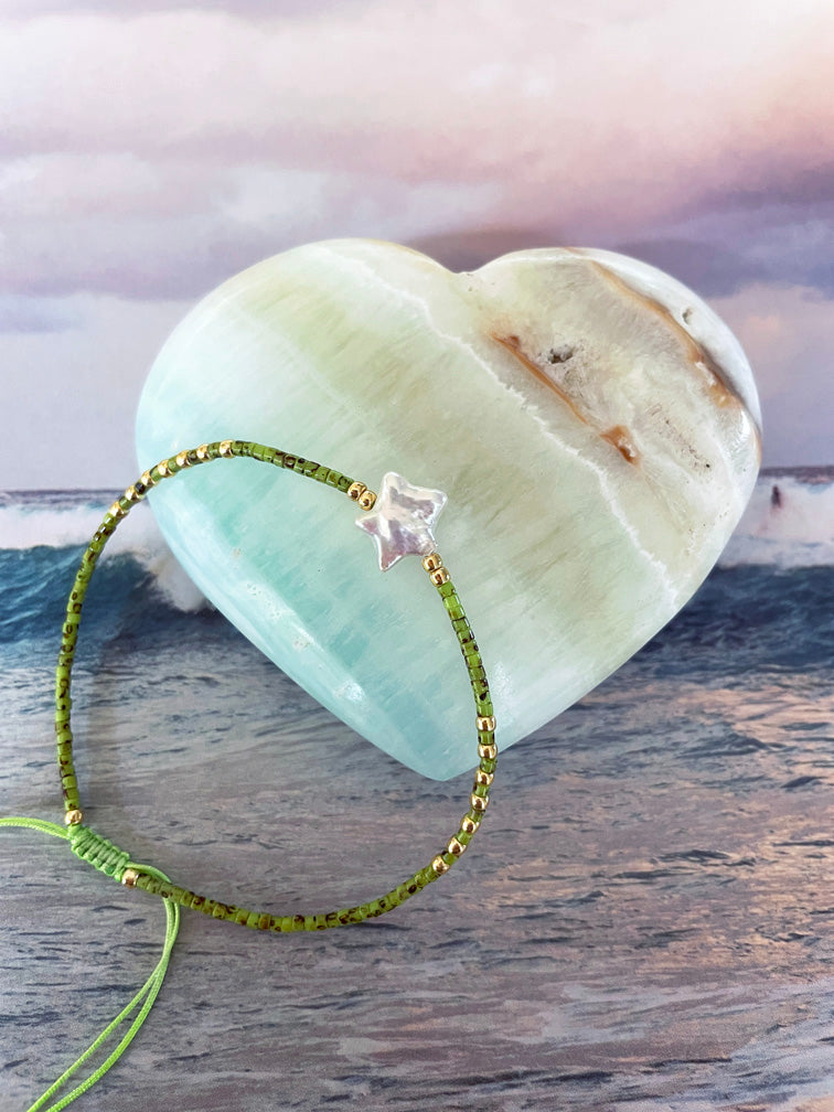 A simple yet chic accessory, this delicate bracelet features a stunning pearl star in the centre and shiny gold beads scattered in amongst dainty Japanese glass beads. It has an adjustable closure.