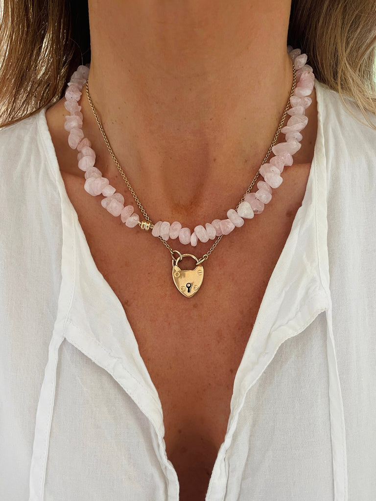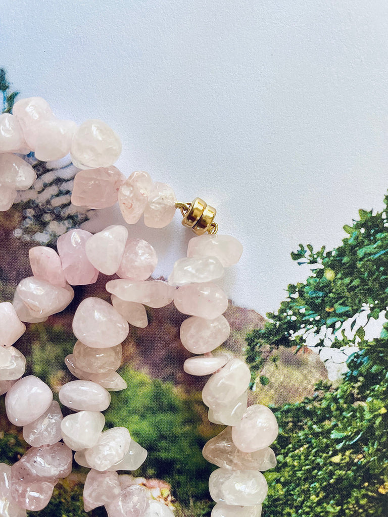 Bohemian elements are at the forefront of the fine jewellery game, an aesthetic reflected in this beautiful necklace, which holds within it the healing properties of Rose Quartz.